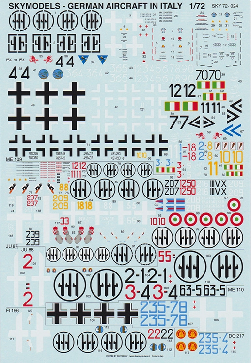 1/72 German aircraft in Italian service. Includes 16 Messerschmitt Me-109G/Me-109K; 1 x Messerschmitt Me-110C; 17 x Junkers Ju-87B/Ju-87D/Ju-87R; 3 x Junkers Ju-88A-4; 1 x Dornier Do-217J; 3 x Fieseler Fi-156 Storch