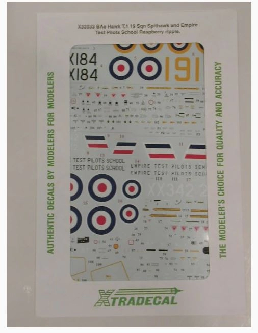 1/32 Ae Hawk T.1/T.1A (2) XX343/2 Empire Test Pilots School (ETPS), Boscombe Down July 1987. Raspberry Ripple scheme with red fin and rudder and rear fuselage with white front fuselage, Oxford blue undersurfaces, light aircraft grey inner wings top, red wing tips. XX343/2 Revised Raspberry Ripple scheme with white band full length of fuselage. XX184 70th Anniversary of equipping 19 Sqn with the Supermarine Spitfire 1938. Dark Earth/Dark Green Supermarine Spitfire type camouflage 2008.