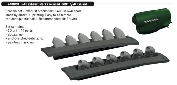 Set Brassin Camini di scarico arrotondati del Curtiss P-40E Warhawk con pneumatici a battistrada incrociato e ruotino di coda in scala 1/48.